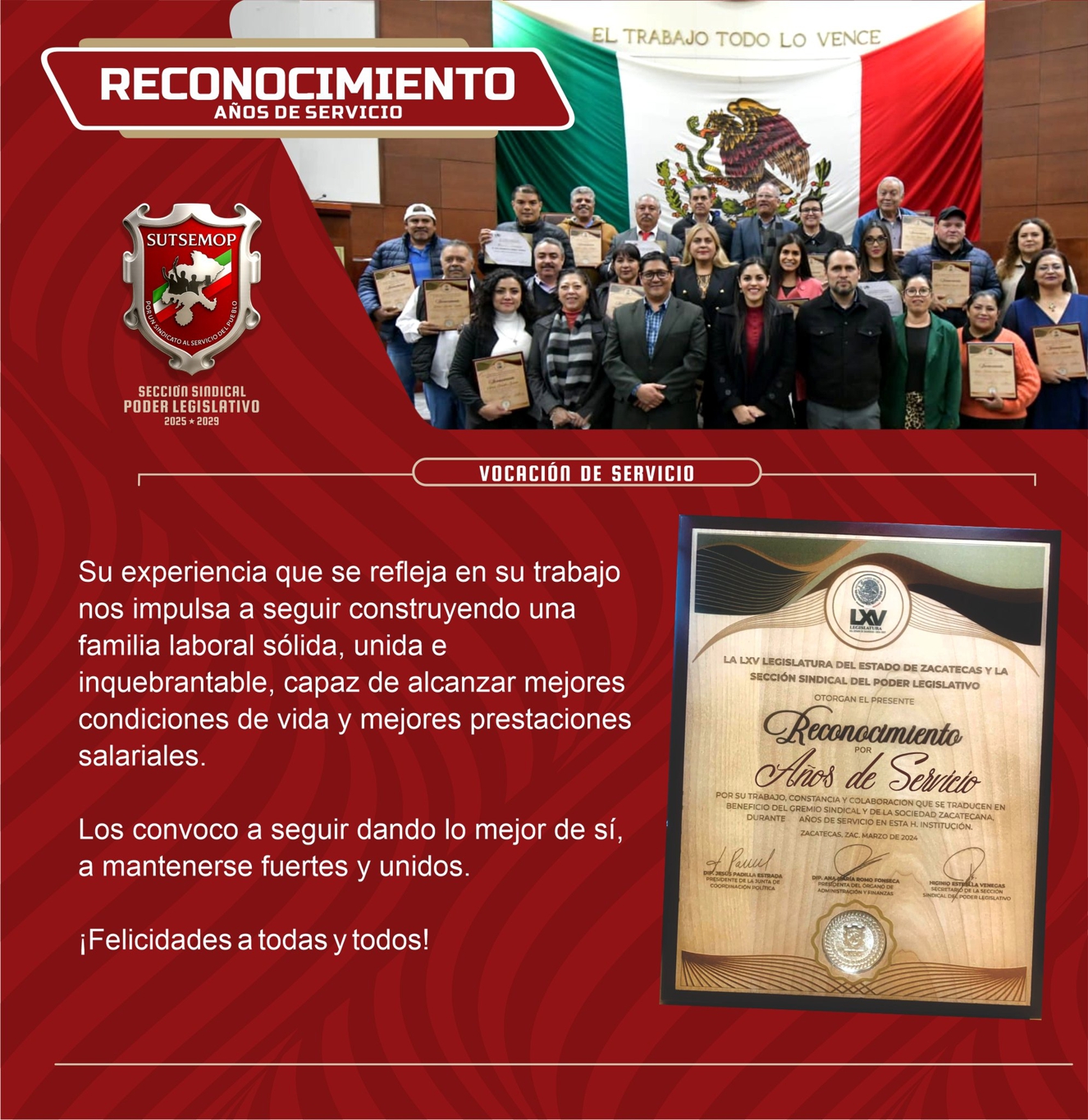 Y anticipó que esa familia laboral debe crecer y solidificarse, “por eso esperamos que, con el apoyo y determinación de las comisiones de gobierno en el empuje de temas presupuestales, el próximo año daremos la bienvenida a nuevos compañeros que habrán de formar parte de la sección sindical. Se lo merecen, es su derecho y para ello esta su representación sindical”.